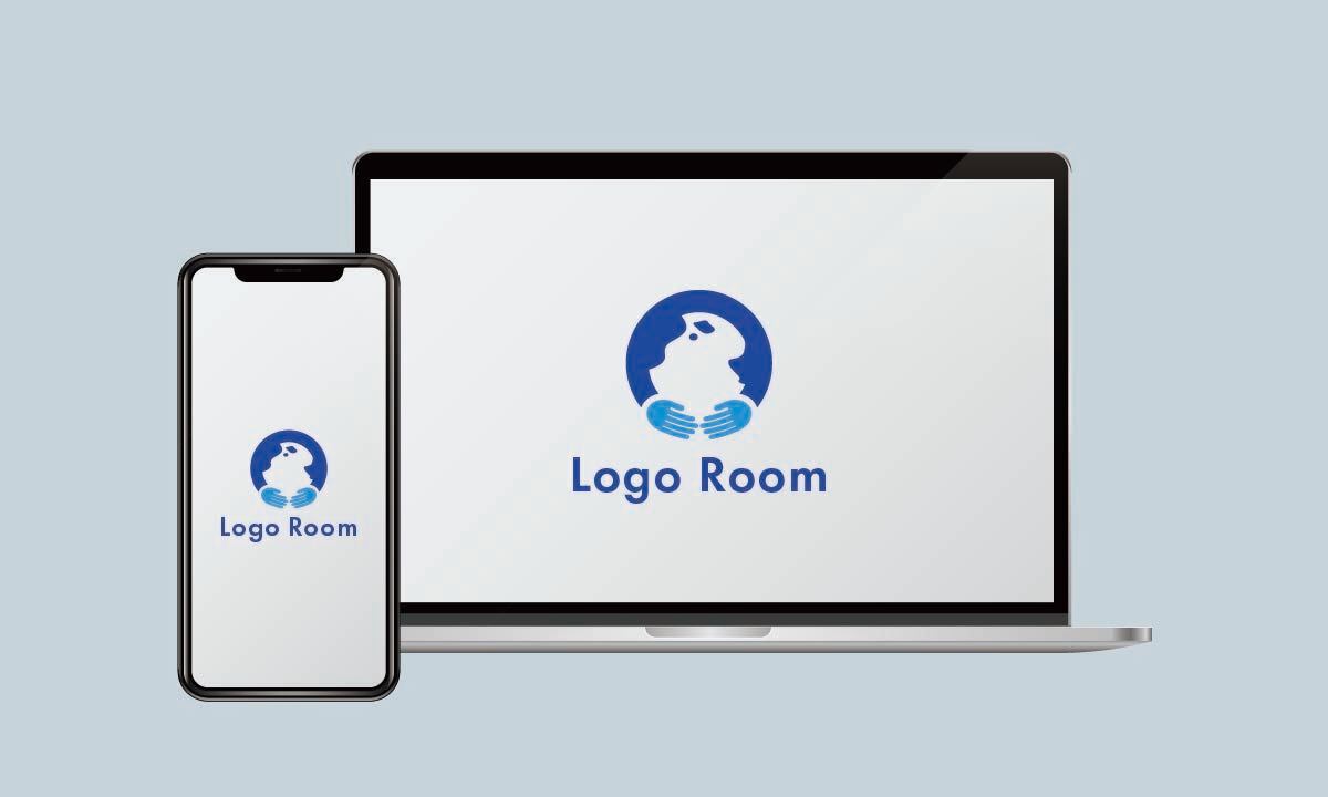 No347 地球と手繋のロゴ【地球、世界、手、繋がり、青、グローバル、シンプル、IT、WEB、ネット、テクノロジー、教育、アプリ】 | 格安ロゴ販売・著作権譲渡込み|店舗・会社のロゴデザイン LogoRoom